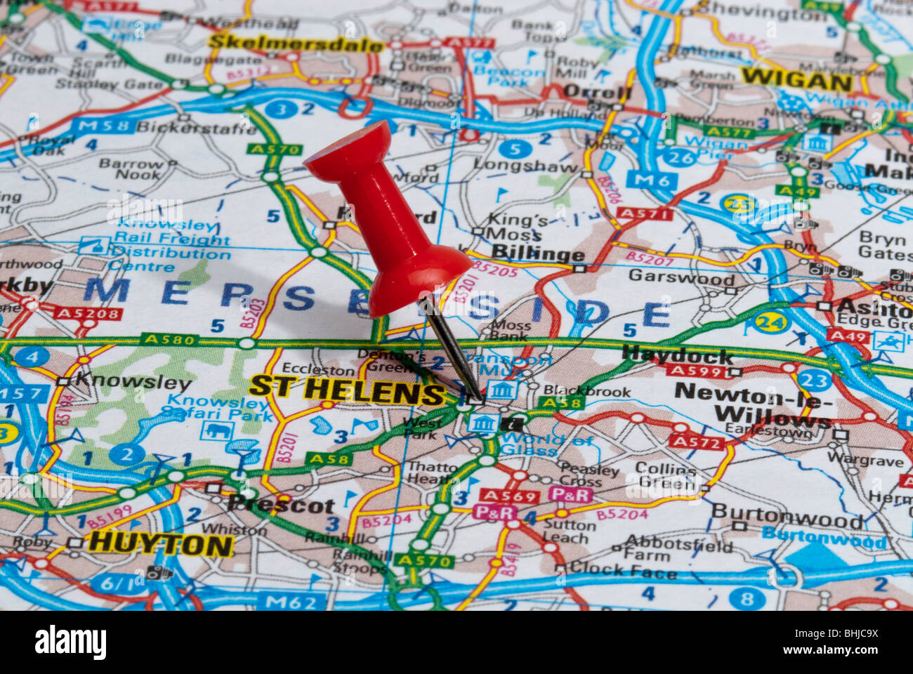 red map pin in road map pointing to city of St Helens Stock Photo